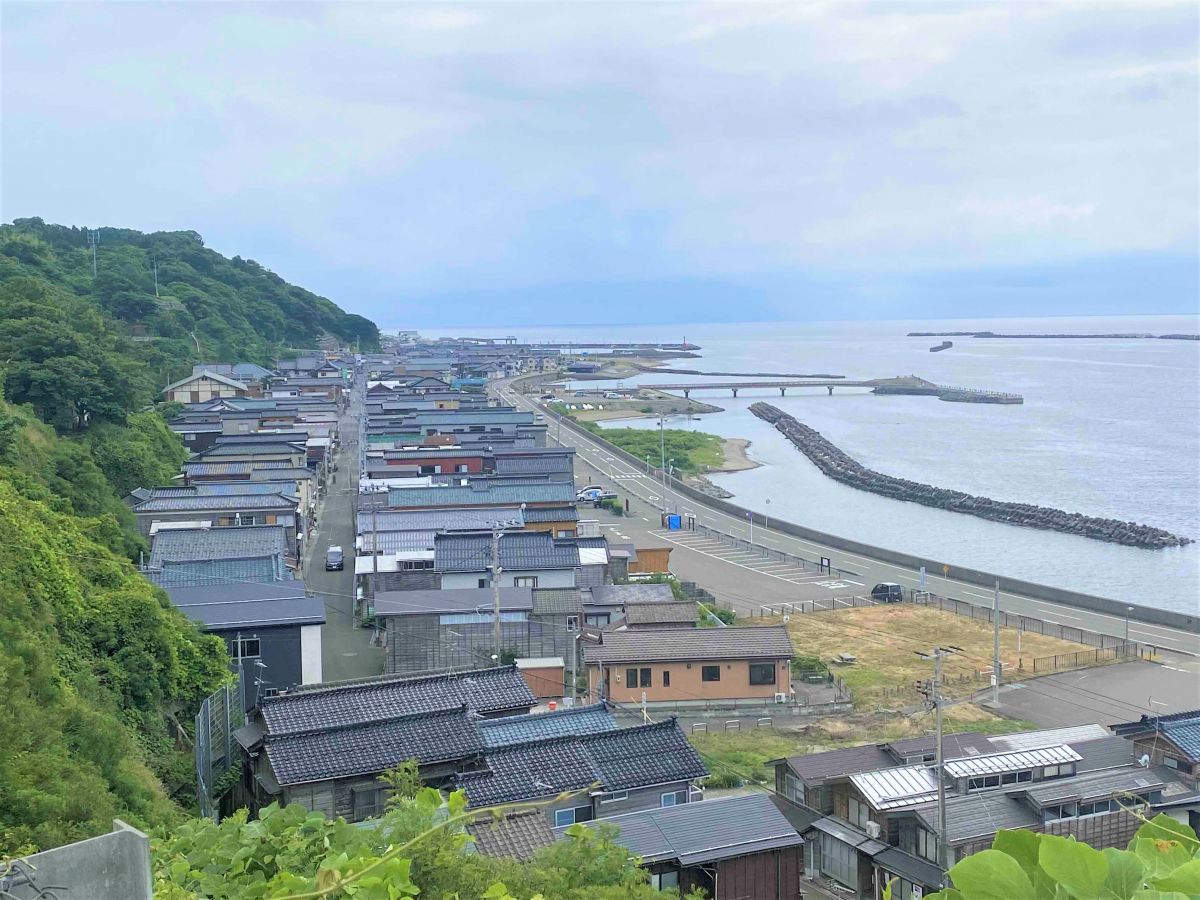 江戸時代、出雲崎は大変栄えていましたが、当時は家の間口の広さで課税されていたため、道路に面して間口が狭く、奥行が長い「妻入り」と呼ばれる建築様式の家が立ち並びました。上からの景色も美しいですね。