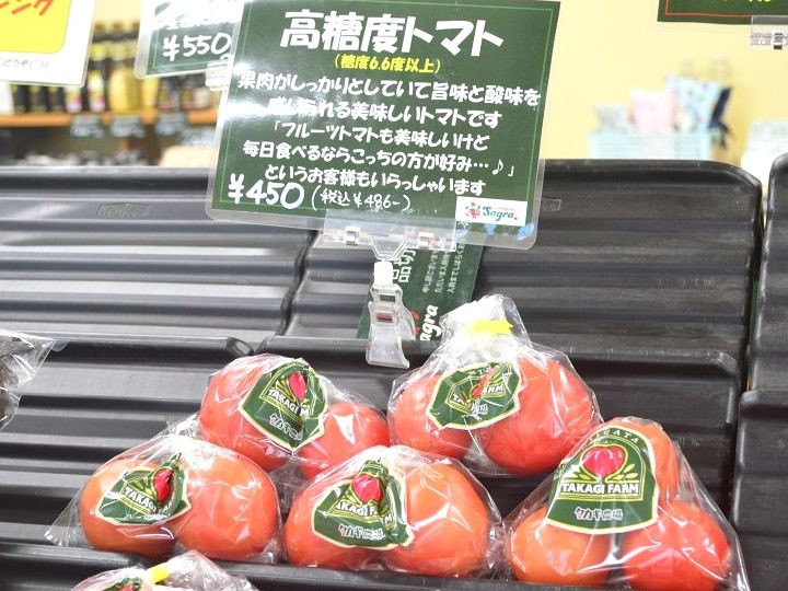 糖度計でチェックされたトマトをレギュラートマト(糖度6.6度未満)、高糖度トマト(糖度6.6度以上)、フルーツトマト(糖度8.6度以上)、スーパーフルーツトマト(糖度10度以上)に分類して販売。