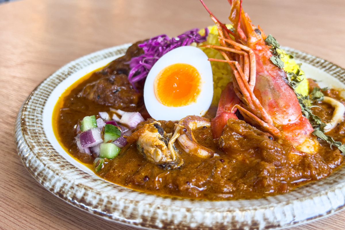 「濃厚えび出汁シーフードカレー」と「角煮カレー」のあいがけバージョンがこちら。中央に鎮座するゆで卵を境に左手が「角煮カレー」、右手が「濃厚えび出汁シーフードカレー」です。「角煮カレー」は辛味が抑えめ。ホロホロの角煮、肉のうま味が溶け出した、しっかりとした味わいのカレーソースが口いっぱいに広がります。一方、「濃厚えび出汁シーフードカレー」は、「角煮カレー」よりも少しだけスパイシーな印象。エビのうま味とスパイスが融合したカレーソースの味わいが秀逸で、スプーンが止まらない。ある程度、それぞれの味わいを楽しんだら、今度はターメリックライスや付け合せも含め、全体を混ぜ合わせて、違う味わいを自分で完成させて、完食。
