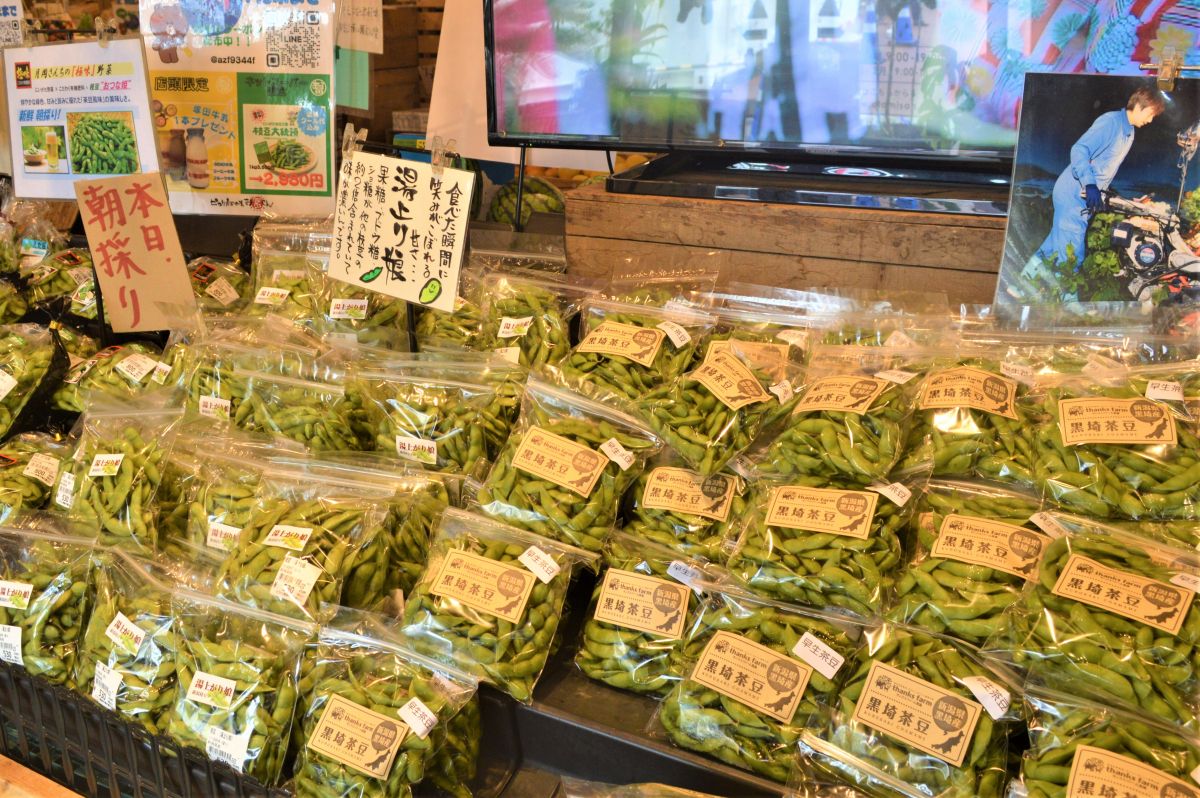 入り口を入った特等席に並んでいるのは、枝豆。棚は枝豆であふれています。