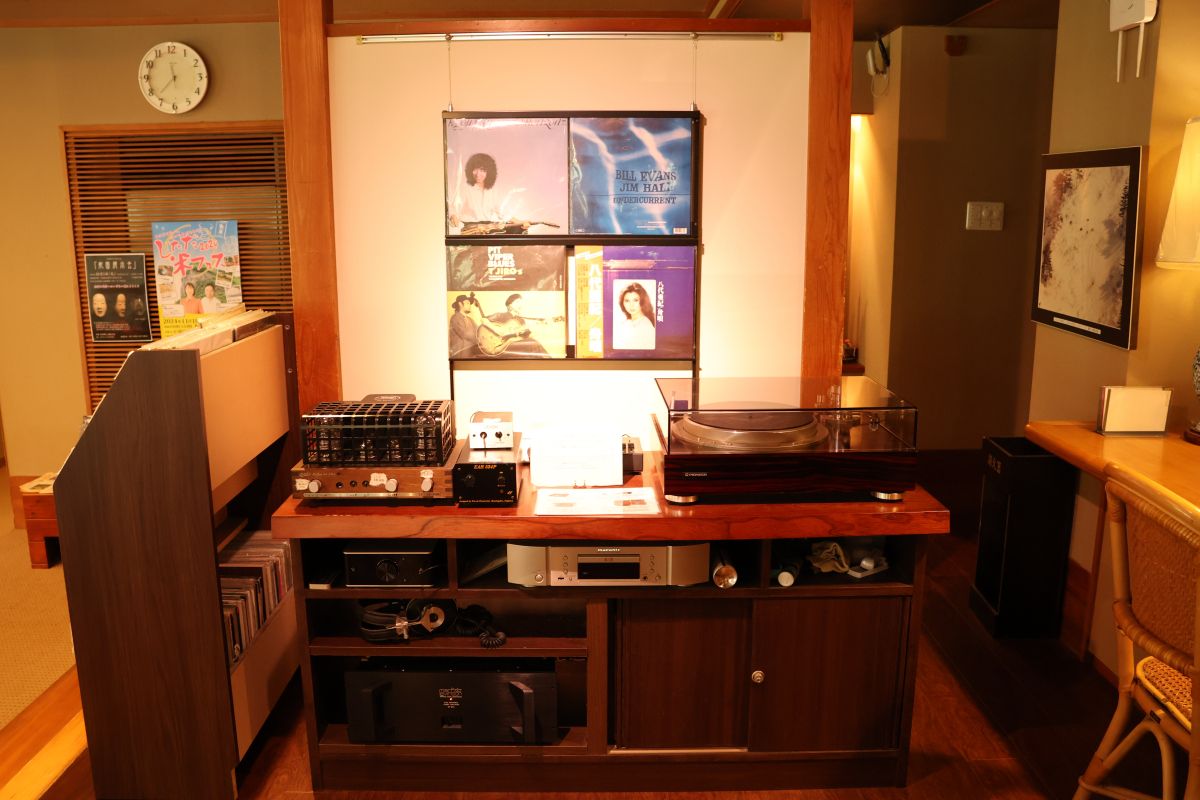 ロビーには、背表紙を眺めているだけでも飽きないような本たちと、たくさんのレコードが置かれています。