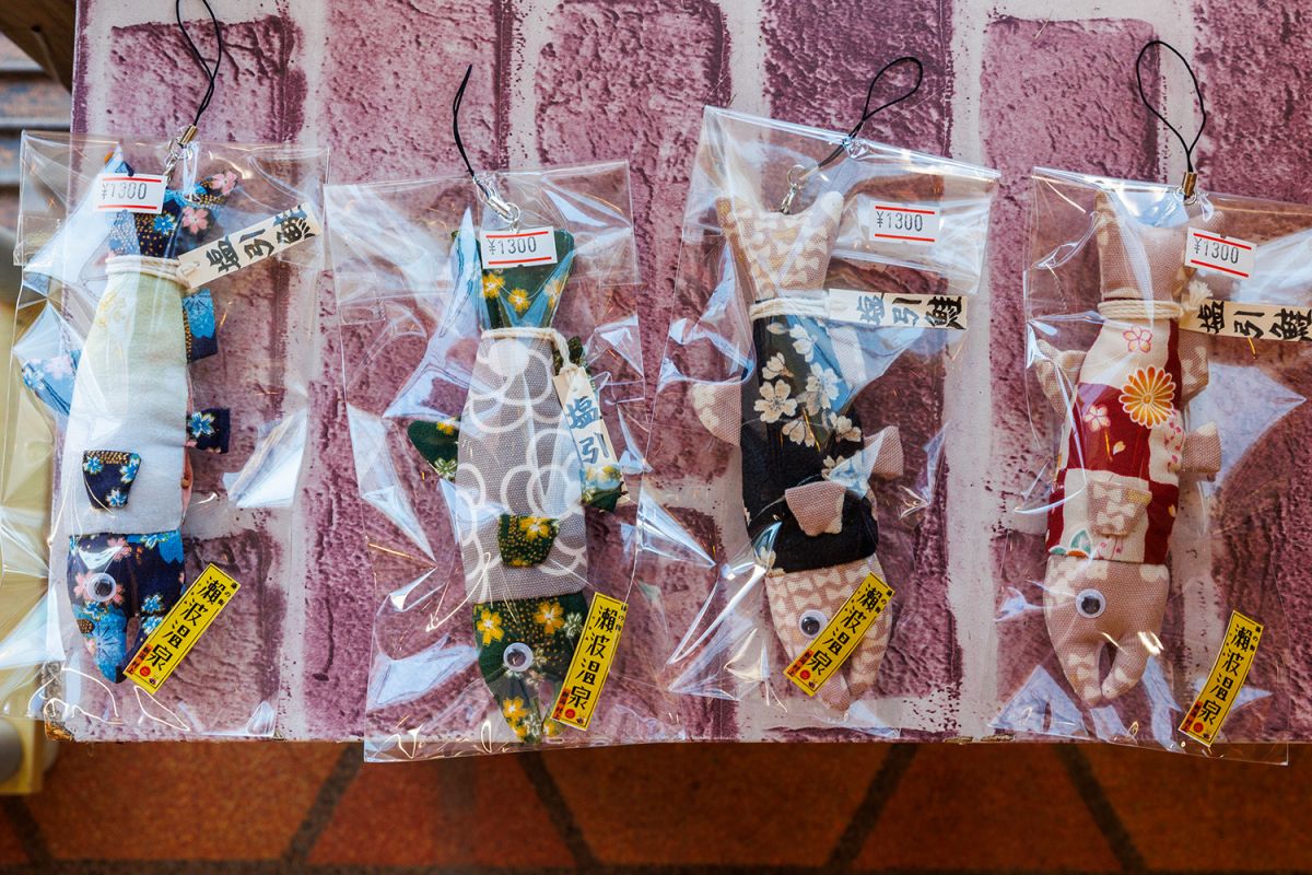こんなものもありました。村上らしさを感じられる一品で、その名も「塩引鮭ストラップ」(1,300円)です。手作りですべて柄が違うのが特徴。お気に入りの一匹をぜひ見つけてみてください。