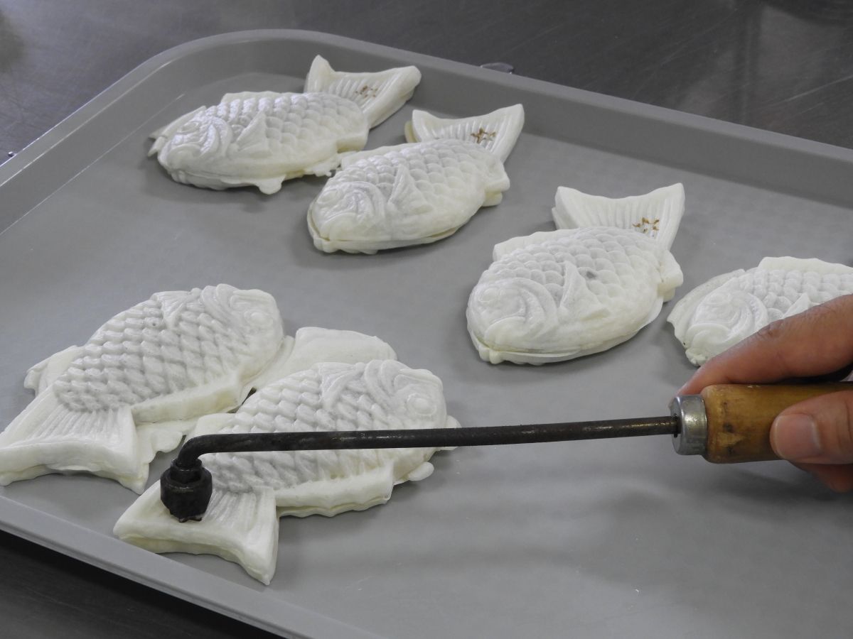 その後、鯛焼きの中身が分かるように、種類に合わせて「焼印」を入れていきます。