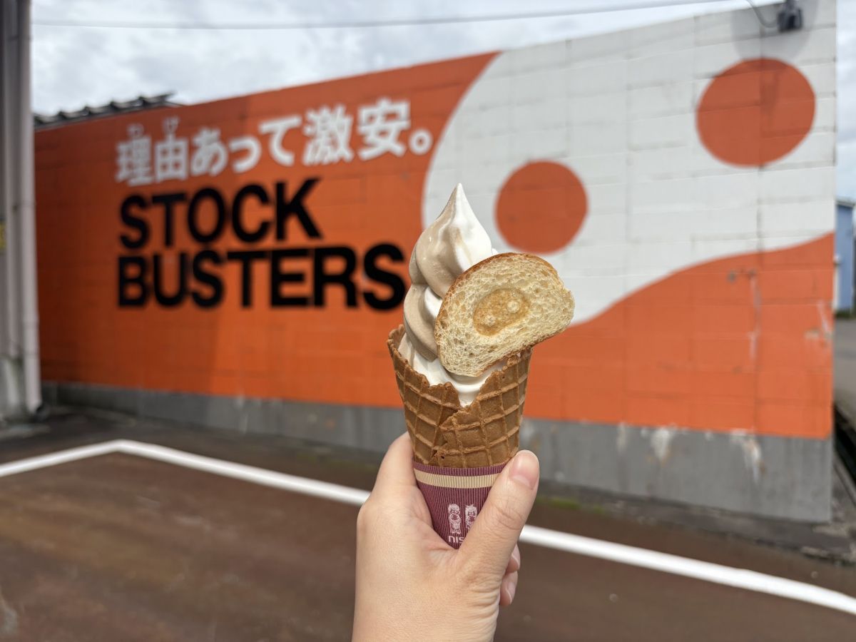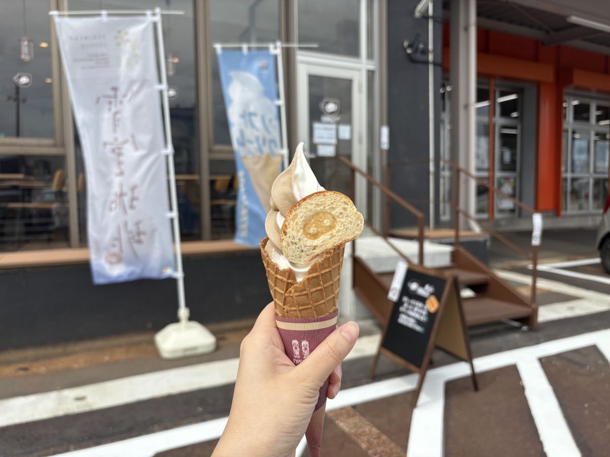 ロゴマークの入ったラスクがトッピングされたソフトクリームは、ちょっとひと息つきたいときにぴったり。