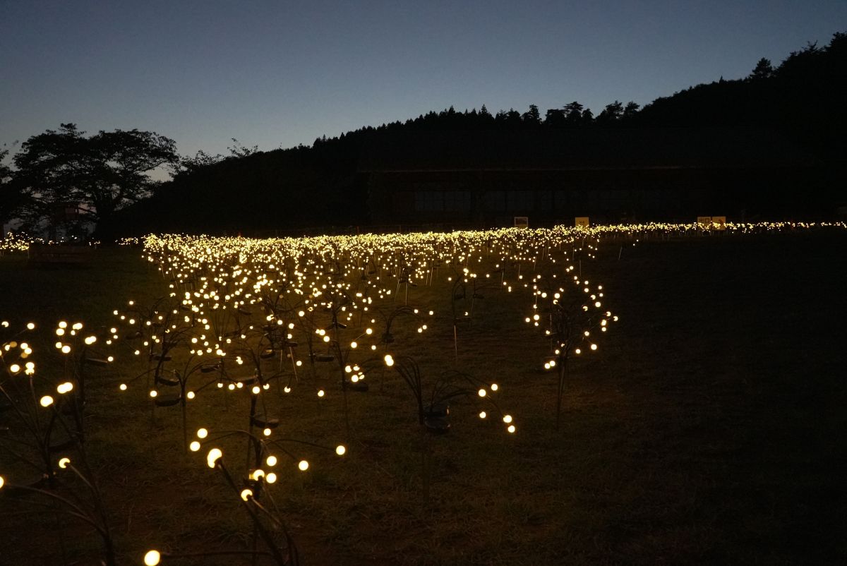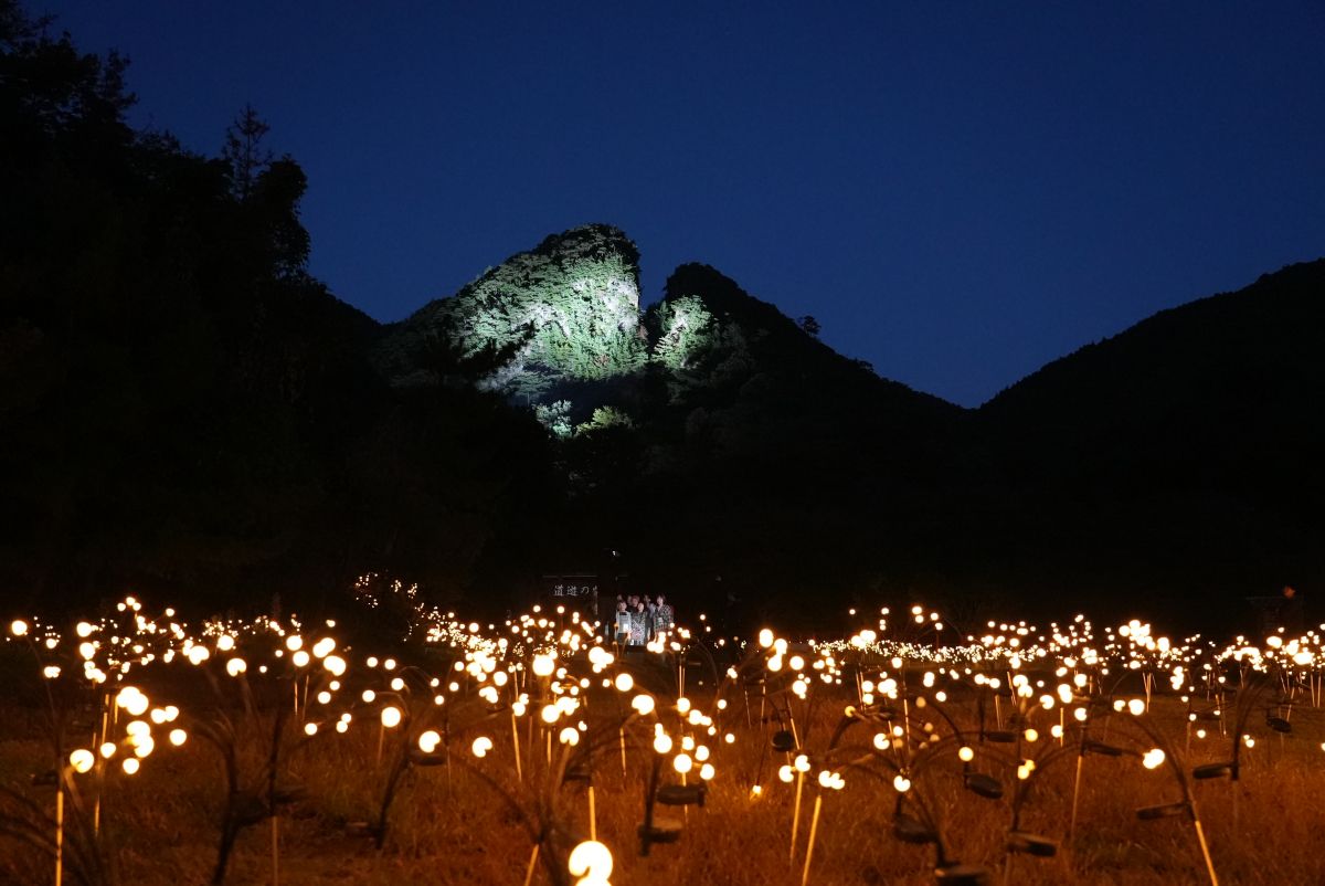 ライトアップされた道遊の割戸、足元に並ぶ木の実の光、静かに流れる音。