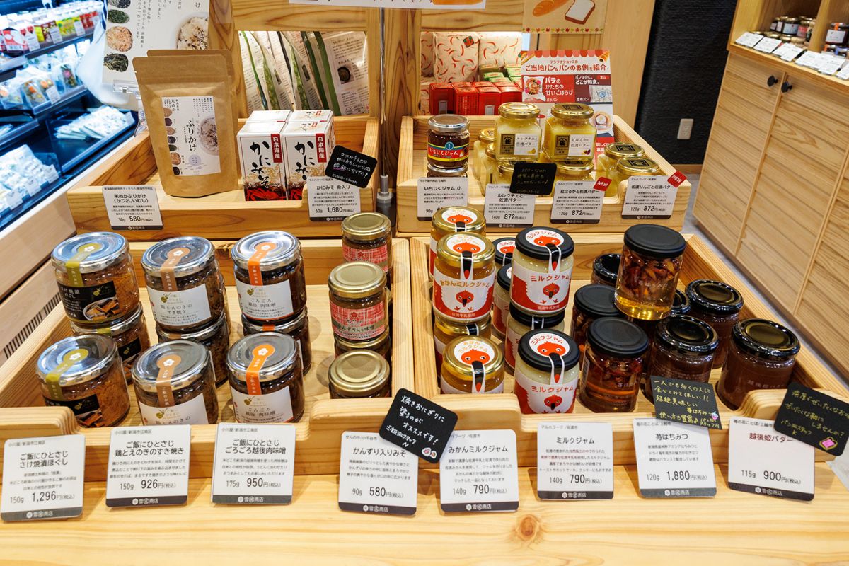 企画展示も実施しています。訪ねたときは「旬のごちそうをさらに美味しくする逸品をスタッフが厳選!」ということで、ごはん派とパン派のスタッフがそれぞれの推しをセレクトするという企画を開催中。ごはん派は小川屋の「ご飯にひとさじ」シリーズなどを、パン派は佐渡バターを使ったスプレッドなどを選んでいました。