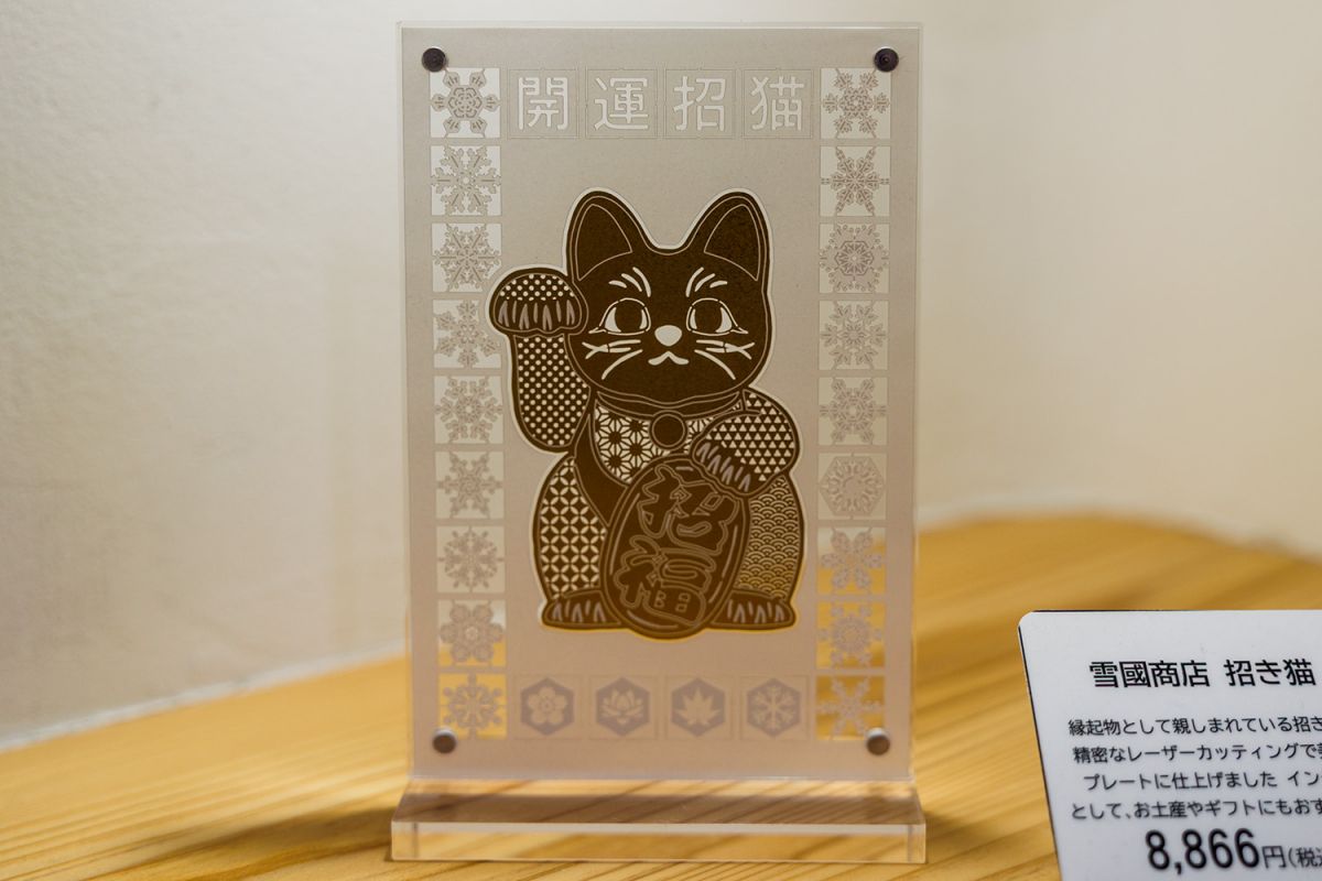 店内全体の印象は、おしゃれな雑貨店のような雰囲気。雪の結晶や和柄をレーザーカッティングした「招き猫」のプレートもありました。