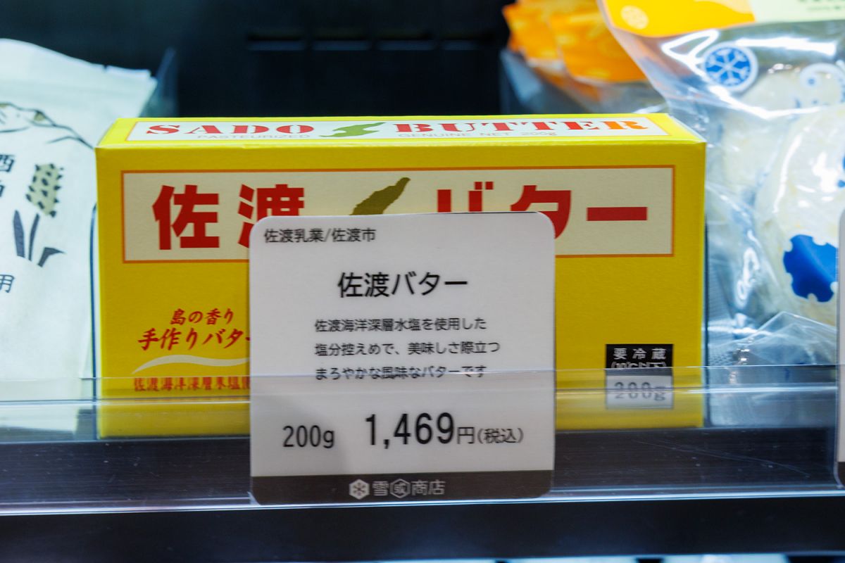 ここで気になったのが棚にちょこんと置いてある「佐渡バター」です。しぼりたての生乳と佐渡海洋深層水を使った塩のみで作られている限定生産品で、佐渡に行っても入手できないことがあるという人気商品なのですが…雪國商店にはありました! 東京から来店した人が「どこを探してもなかったのに」と喜んだこともあったそう。ファンにとっては、思わぬ穴場かもしれません。(ふるさと納税の関係で年末からしばらくは入荷中断の可能性あり)