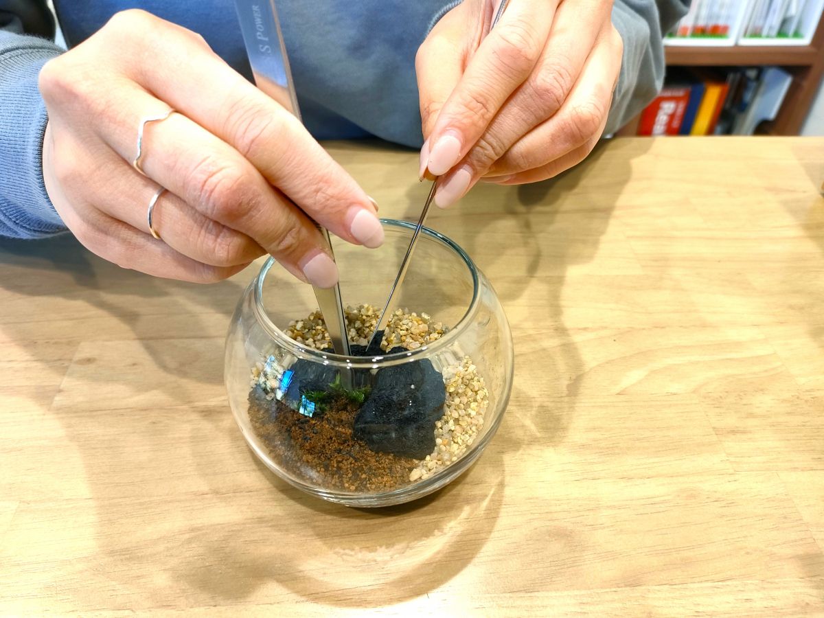 ちょっと繊細な力加減が必要なのか、押し付ける作業で苔がばらばらと崩れていってしまい、センスないのかな~と思ったのですが「とても上手にできていますよ」とスタッフさんにお墨付きをいただきひと安心。