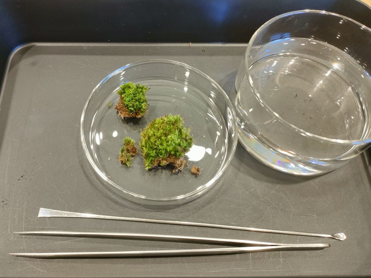 その苔を水につけて洗い、ピンセットで容器内の土部分に「苗のように植えるのではなく軽く押し付けるように貼る」作業を行います。