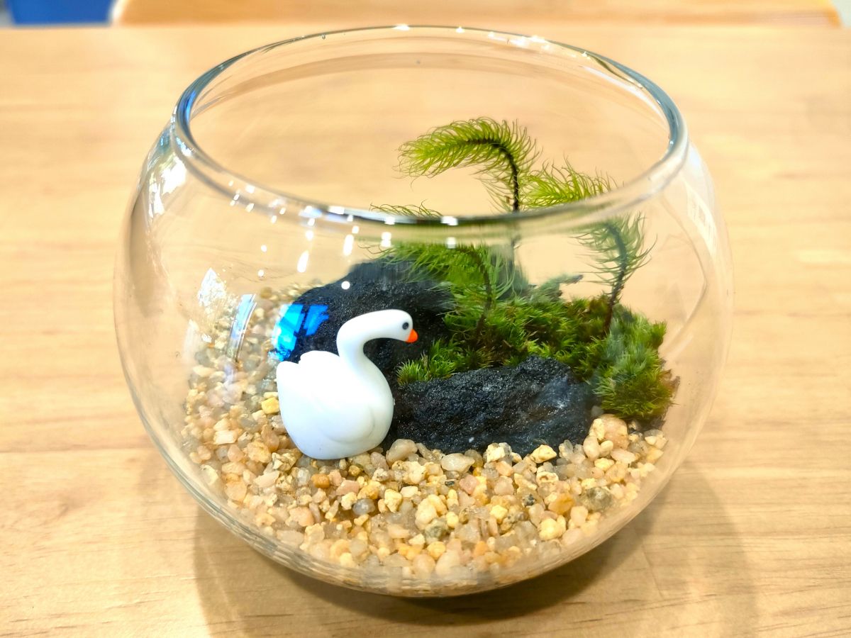 ちなみに「テラリウム」とはガラスなどの容器の中で植物や生き物を育てる方法のことで、小さな自然を器の中に詰めて表現した温室のようなものです。