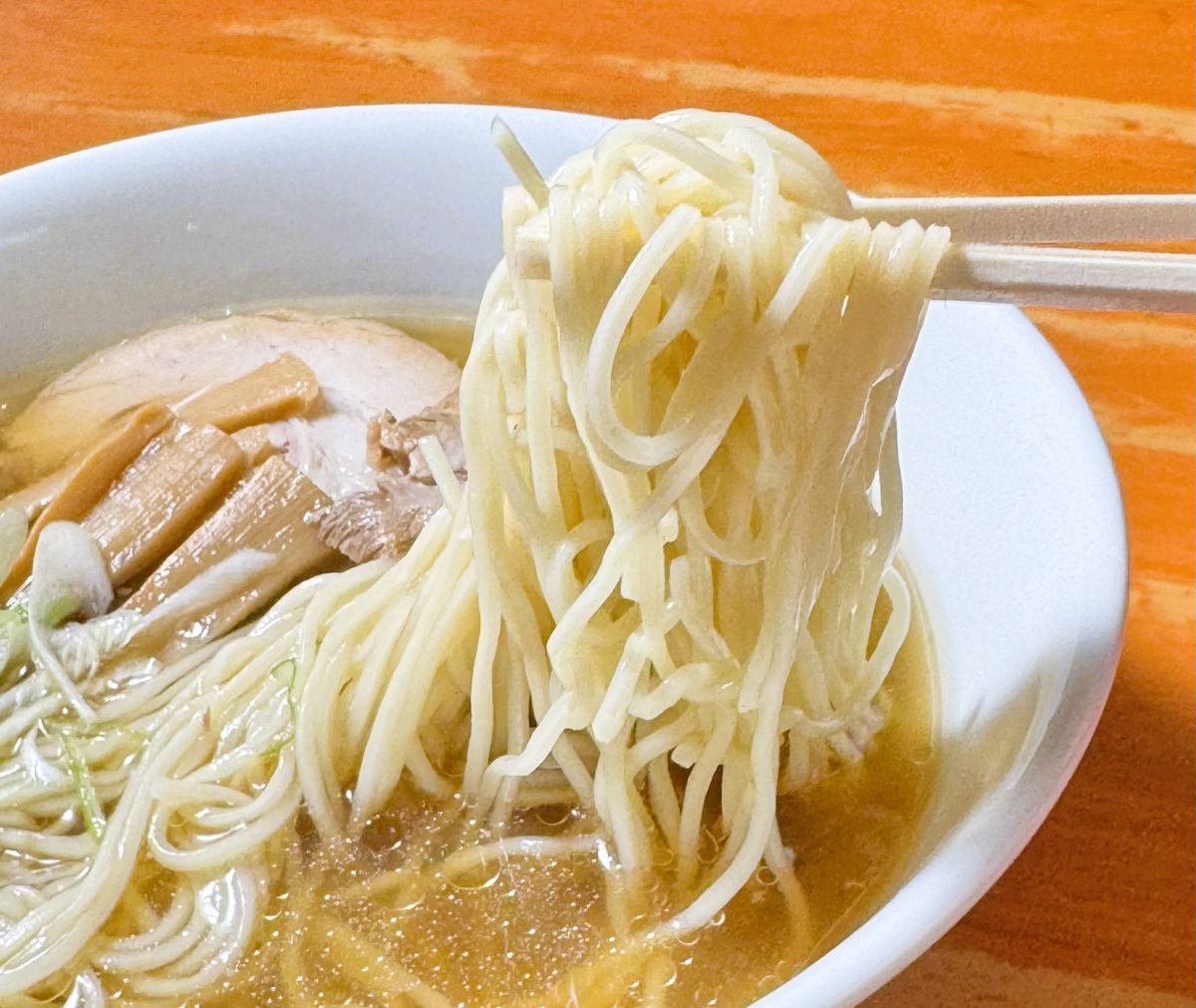 麺は自家製の細ストレート。2種類の小麦粉を独自にブレンドしていて、麺を勢いよくすすると小麦の風味を楽しめます。