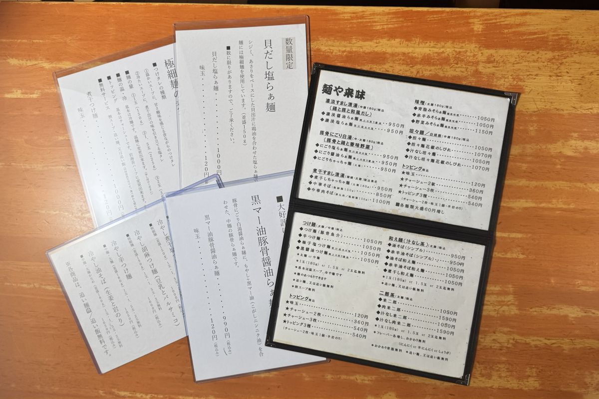 今回紹介した中華そば以外に背脂たっぷりの「ちゃっちゃ麺」やつけ麺、担々麺、みそラーメン、そして二郎系の「来二郎」までそろっています。さらにつけ麺は麺が2玉まで増量無料、汁なし系は追い麺か追い飯が付くという太っ腹ぶり。