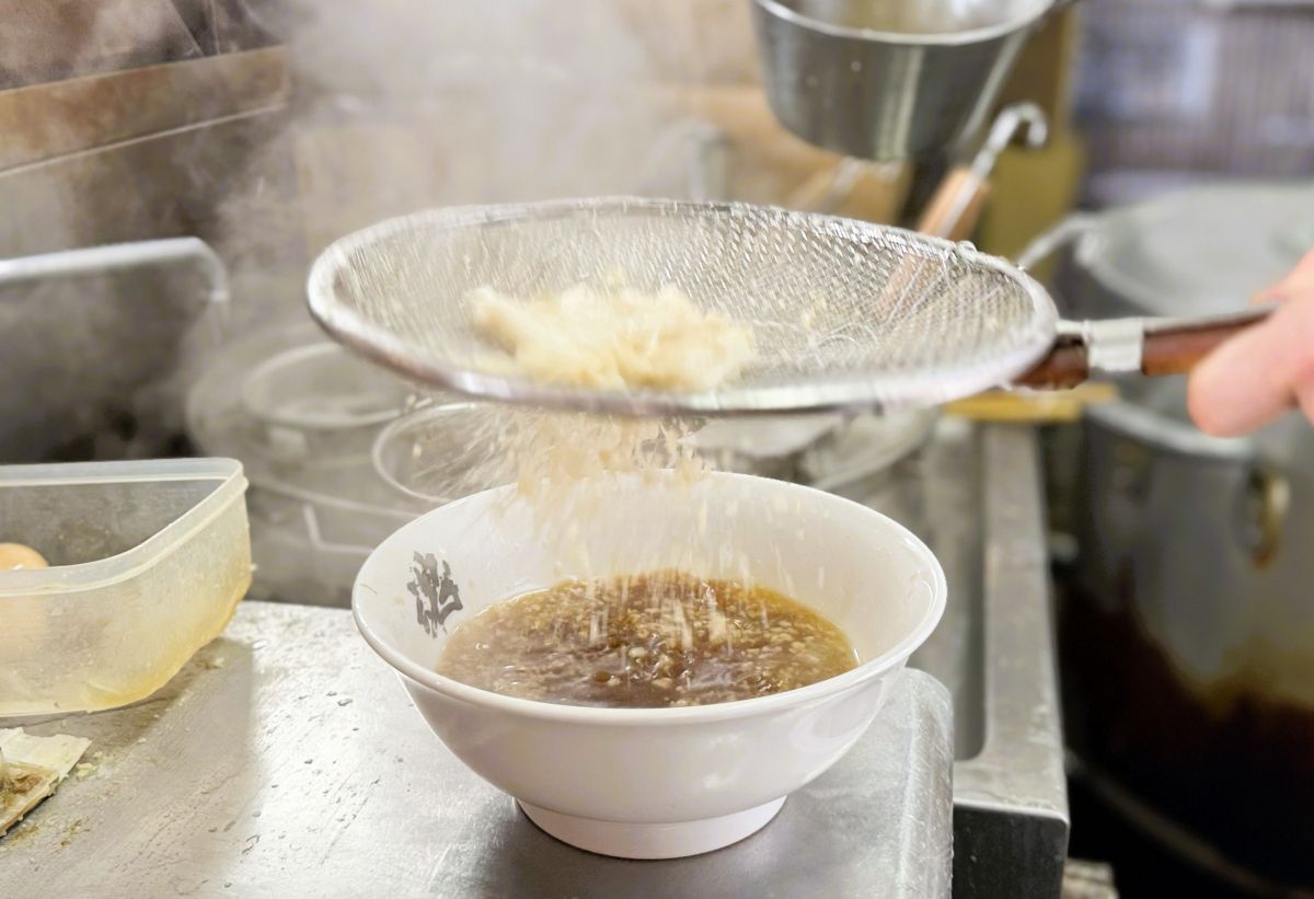 ザルを使って丼の上に振りかける背脂。あまり知られていませんが品質には厳しいランク付けがあり、滋魂では最高級の「A脂」のみを使用。べと付きや臭みはなく、豚本来の甘みのみを楽しめます。