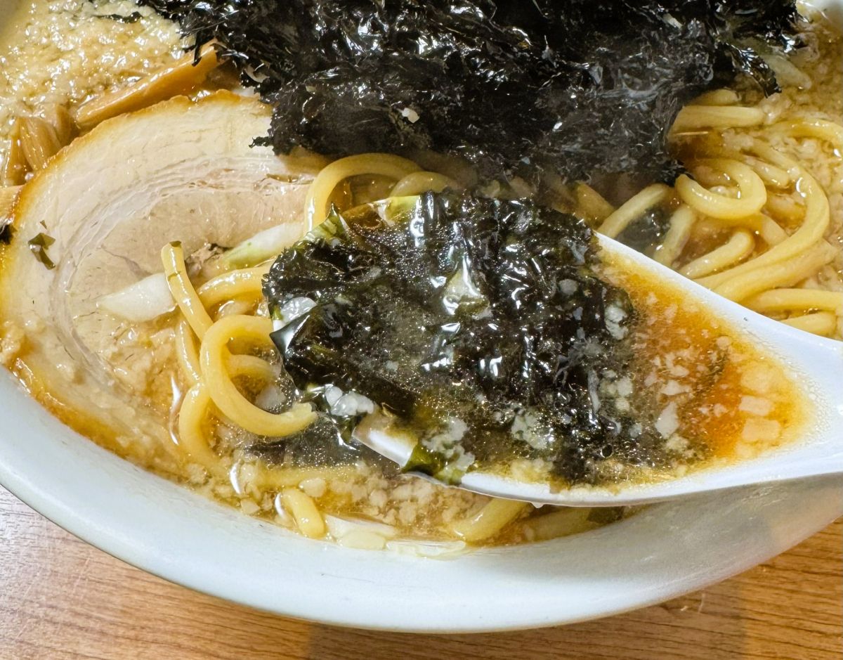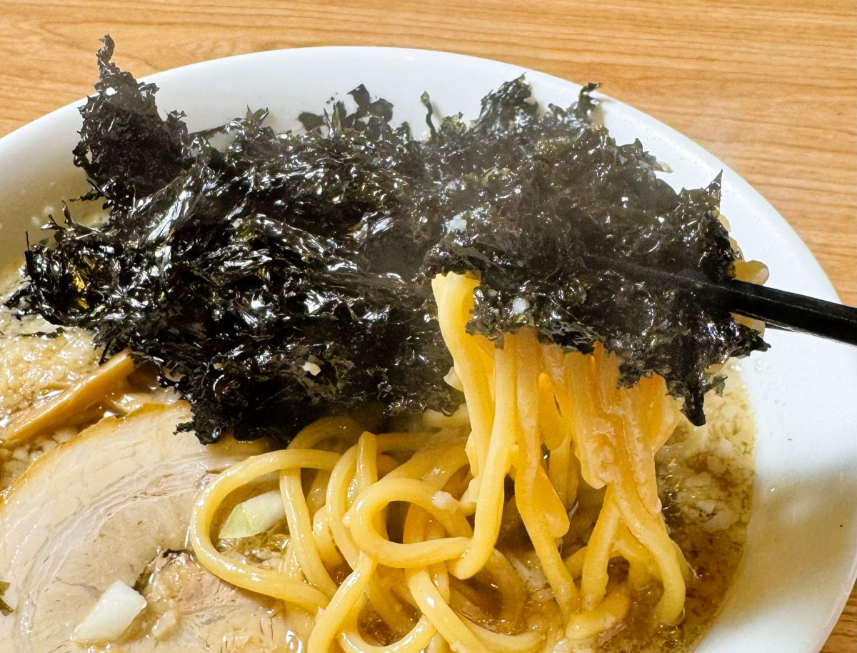 鮮度のいい岩のりを使用しているため、ラーメンが運ばれた時点で磯の香りがくすぐり、煮干しの香るスープと絡めると魚介感がさらに高まります。