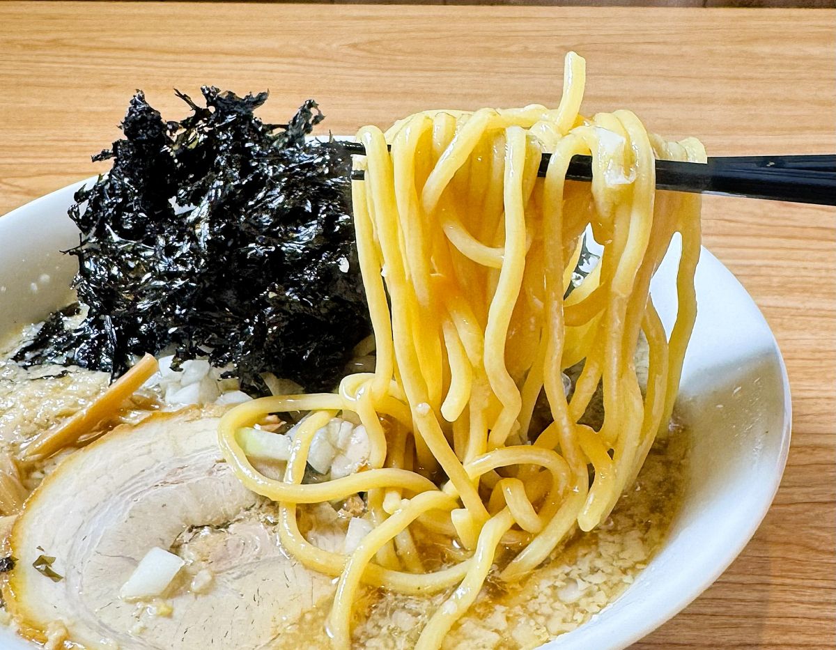 滋魂の麺は修行元の「ラーメン潤」から仕入れていて、やや丸い形状。背脂をまとったのど越しは抜群で、すするたびに煮干しがフワリと香ります。