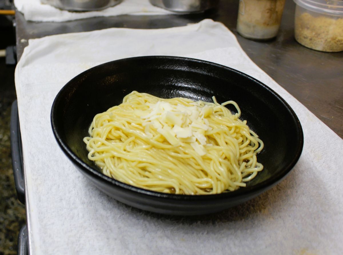 もっと濃厚にしたい人は「炙りチーズマーボーメン」(1,200円)が必食。背脂をのせた麻婆豆腐の上にチーズをどっさりのせ、バーナーであぶるのでドリアやグラタンのような濃厚仕上げに。期間限定メニューがあまりの人気でレギュラーに定着した、オススメの1杯です。