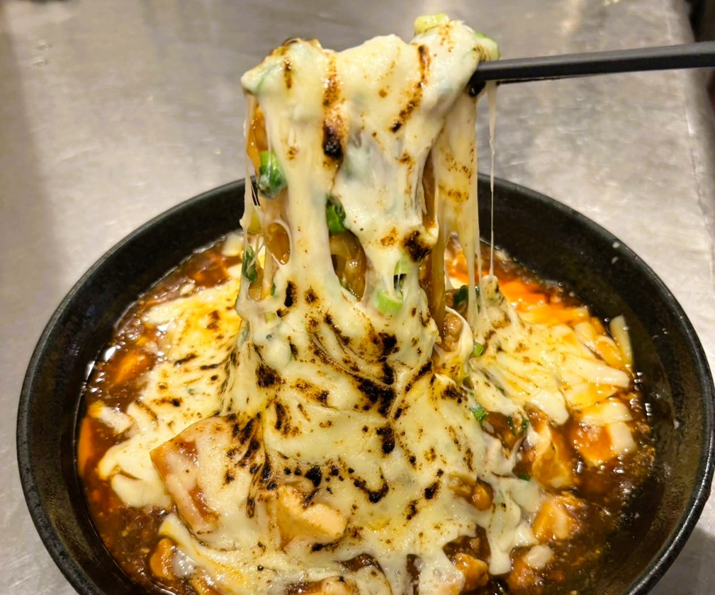 麺の上にチーズをたっぷり!その上に麻婆豆腐をのせるので、食べ進むうちにチーズがとろけて麺が絡みまくります。