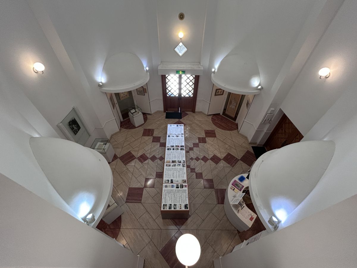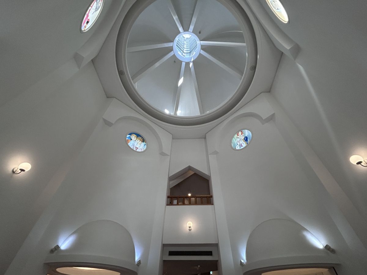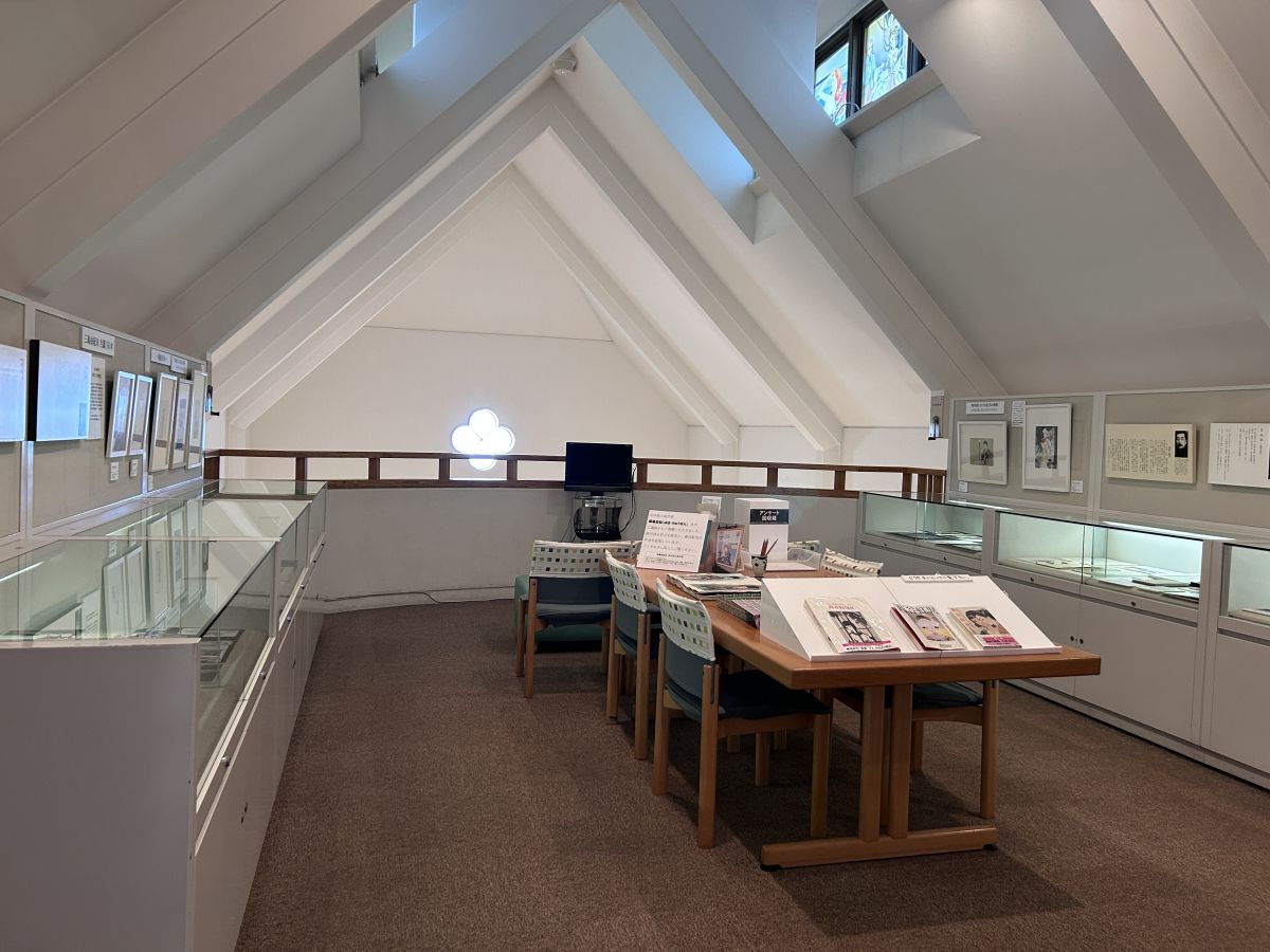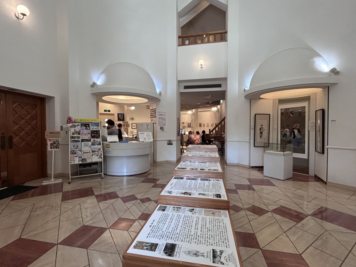 入館すると教会のような吹き抜けのホール!上の方には蕗谷虹児の絵が描かれた丸窓が光を通しています。