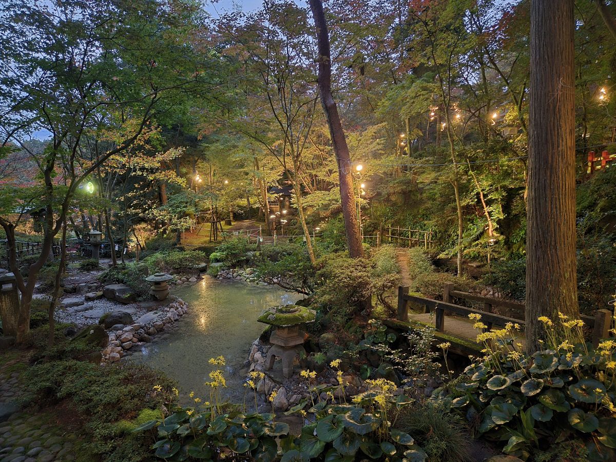 やがて日が傾き庭のあちこちに灯りがともると、昼の穏やかな庭が少しずつ幻想的な世界に変わっていきます。