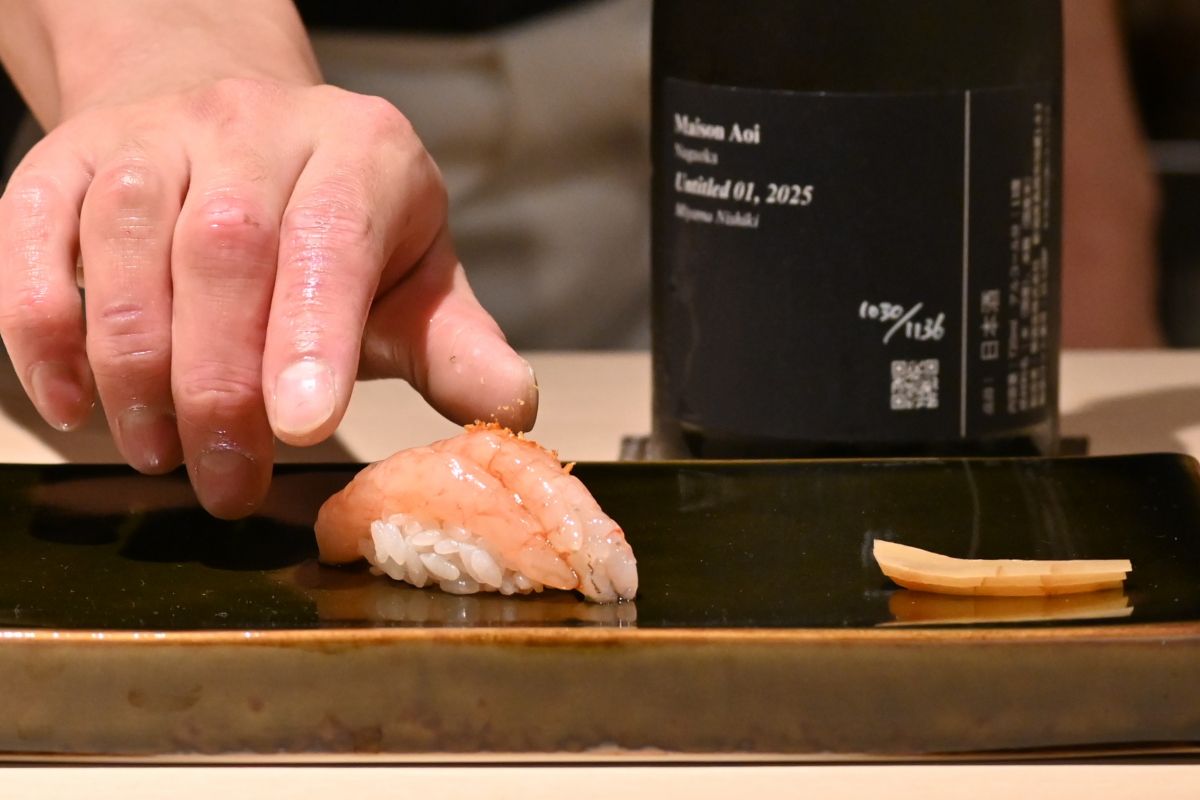強い甘みが特徴の新潟を代表するネタ、南蛮エビ。黒衣では、身とシャリの間にエビ味噌を忍ばせ、さらに身の上には、殻を炒って作ったパウダーが! ねっとりとした旨味が広がる中に、シャリの酸味が爽やかに立ち上がり、エビの甘さのみならず、香ばしさや濃厚さも余すことなく味わえます。絶品!