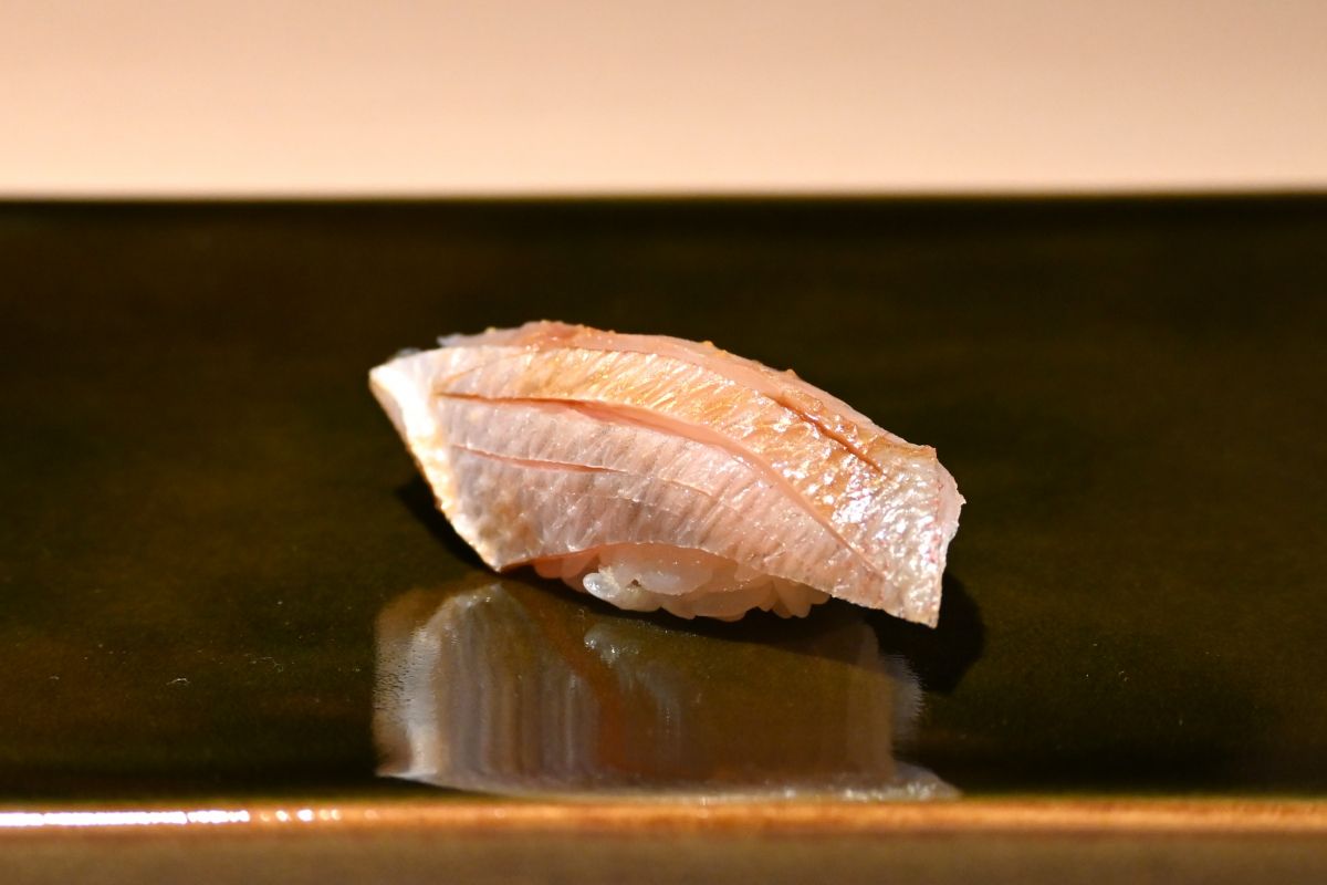 「春子鯛」は小鯛の総称。一晩寝かせ、旨味をじんわり引き出しています。やわらかい白身の輪郭をシャリが際立たせ、序盤から心を掴まれる一貫です。