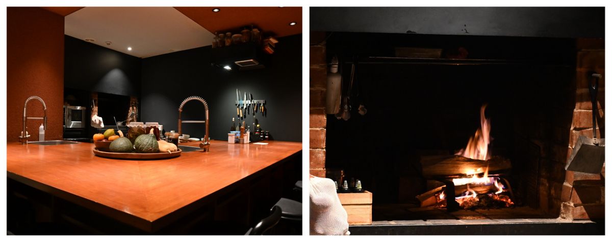 店内はカウンター8席のみで、木目を基調とした落ち着いた雰囲気。薪火の香りがふわりと漂い、これから始まる時間への期待が一層高まります。