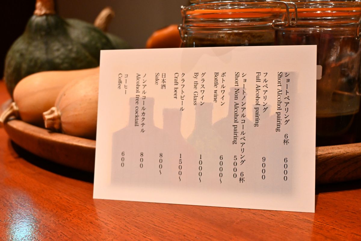 メニューはコース料理のみで、ランチは12時から、ディナーは19時からの一斉スタート。ドリンクは単品でもオーダーできますが、アルコール・ノンアルコールともにペアリングが充実しているので、料理と合わせて楽しむのがおすすめです。21時以降は、バー営業も行っているそうですよ。