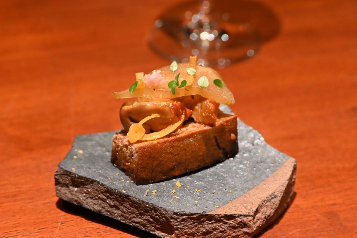 新潟の安田瓦で作られた特注の器に、炊いたあん肝と奈良漬、スパイスを合わせた一皿。下には焦がしバターと、燕市のしょうゆを使ったソースを染み込ませたパンを合わせ、軽くスモークして仕上げています。濃厚なのに重くなく、最初の一皿からいきなり心をつかまれました。あん肝のお寿司からヒントを得たそうです。
