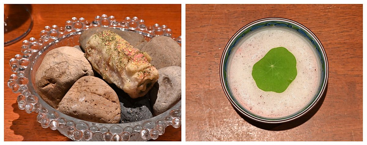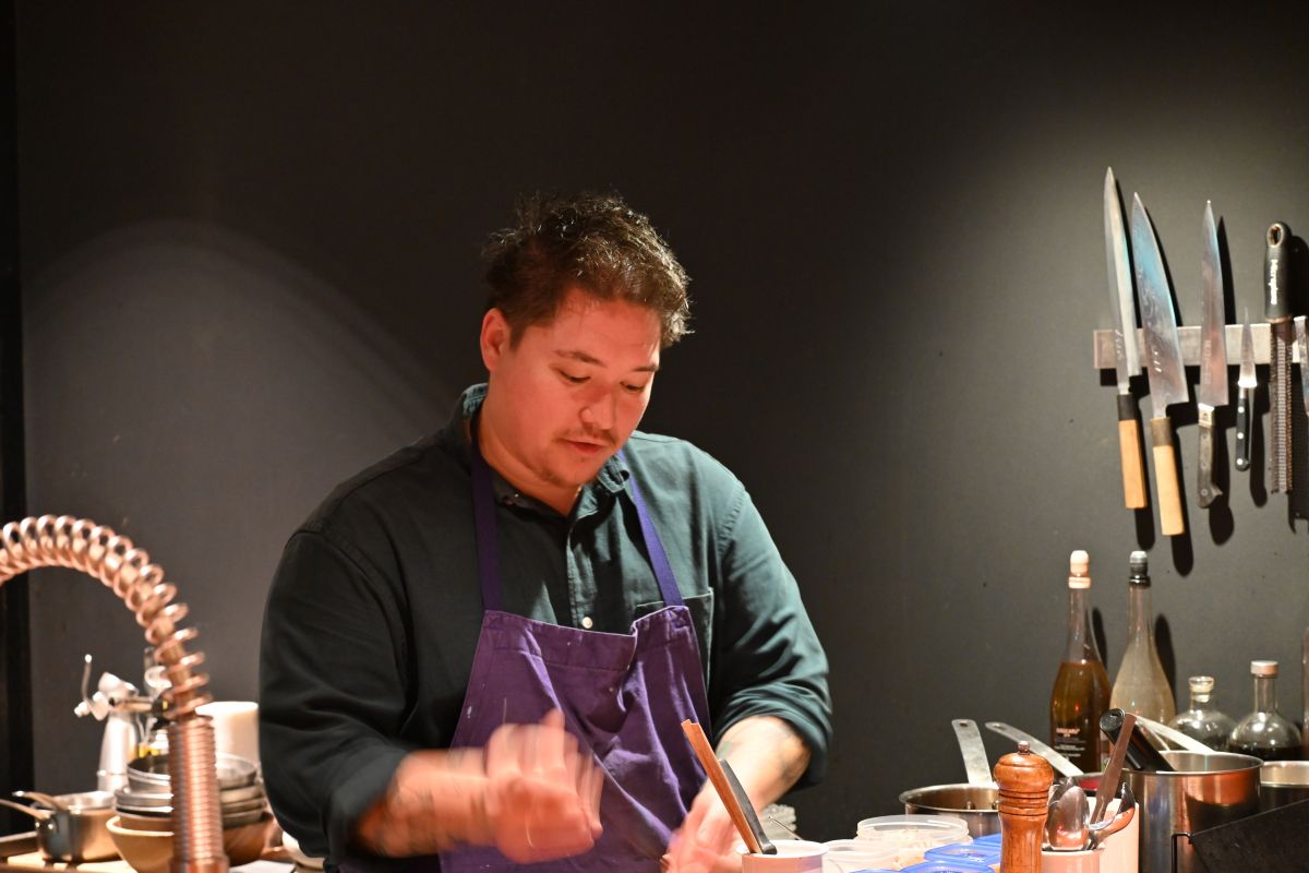 1週間熟成させたブリを薪火で炙り、洋風のポン酢ソースでマリネ。大根の漬物やミョウガ、自家製ハーブを添え、コンブチャ(発酵飲料)やバジルオイルで香りを重ねています。「ブリしゃぶとブリ大根を組み合わせたようなイメージです」とシェフ。自由な発想に驚くばかり!
