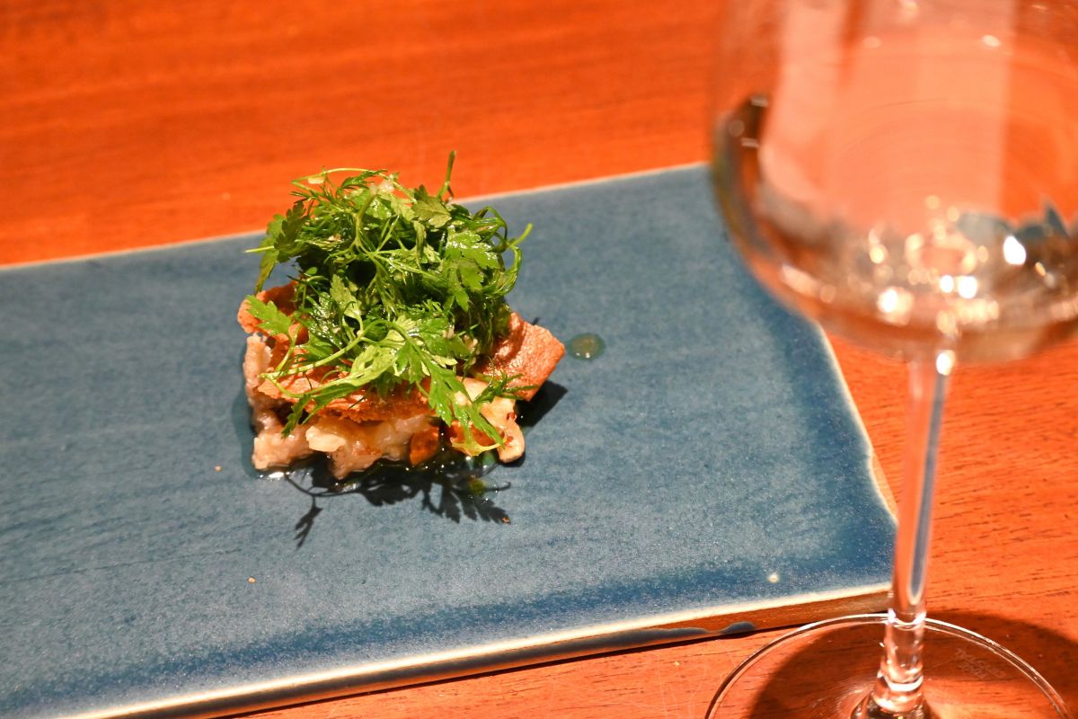 SAISONのスペシャリテである貝料理。鮮度の良い新潟産のツブ貝を細かく刻み、香ばしく砕いたタルト生地の上に重ね、ハーブオイルや発酵由来のソースで仕立てた一皿。生貝ならではのコリッとした歯ざわりとうま味、そしてタルトの軽い食感と香ばしさが一体となって広がります。