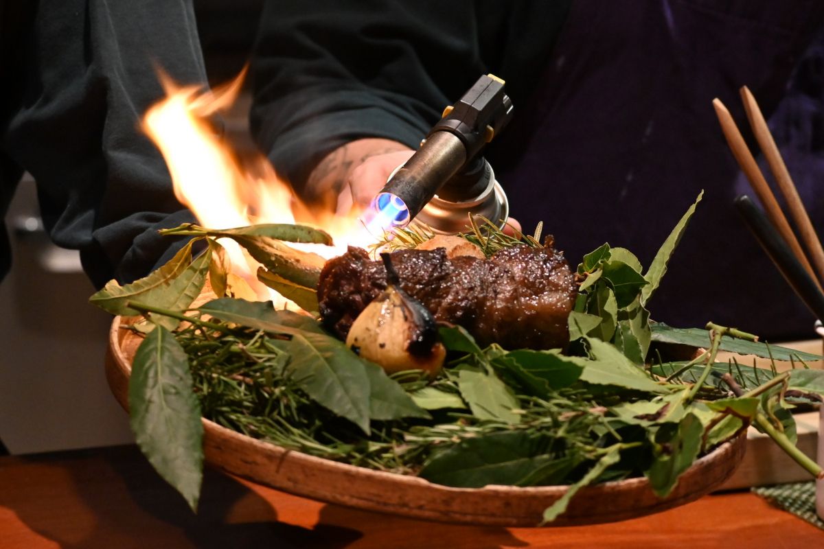 経産和牛を部位ごとに火入れや熟成を変えて仕上げ、当日摘んだフレッシュなローリエ、ローズマリーで香りづけ。提供前に目の前で軽くスモークする演出には、思わず歓声が上がりました。