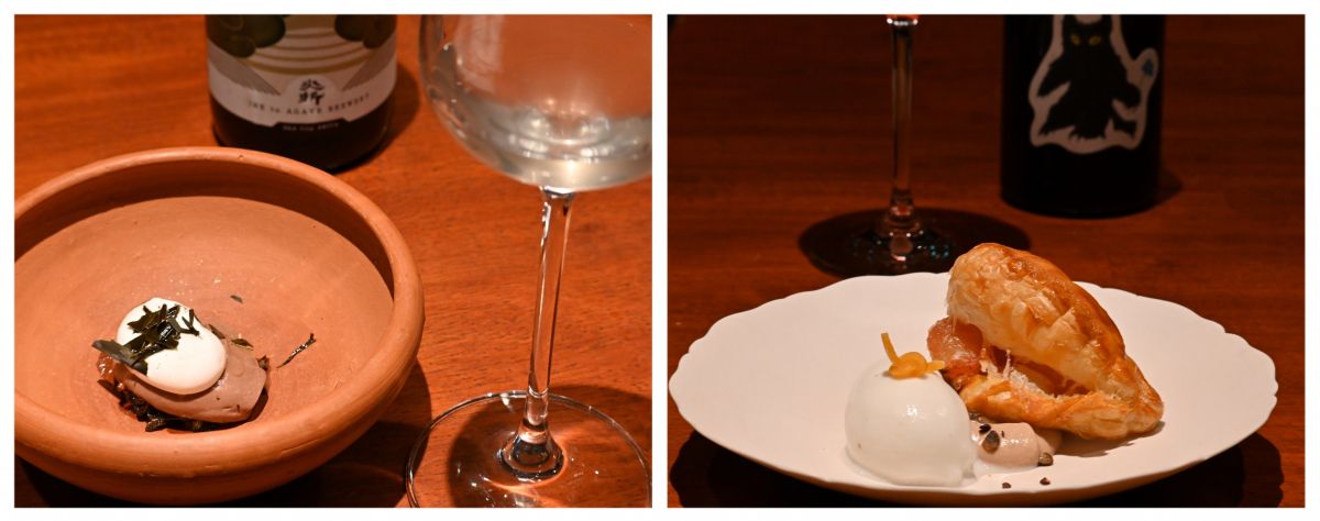 さらにSAISONのペアリングは、ワインや日本酒に限りません。焼酎、薬草酒、ノンアルドリンクまで幅広く登場し、料理に最も合う一杯が自由に選ばれます。今回のデザートには、稲とアガベ(秋田県)のクラフトサケや、蜂蜜酒(ミード)に新生姜を加えた一杯など、多彩な組み合わせが続きました。