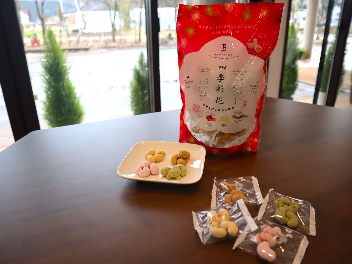 カシューナッツをサクラ、抹茶、メープル、チーズと4つのフレーバーで包んでいます。