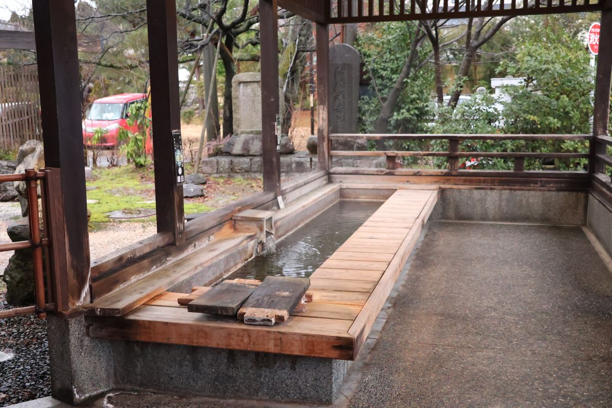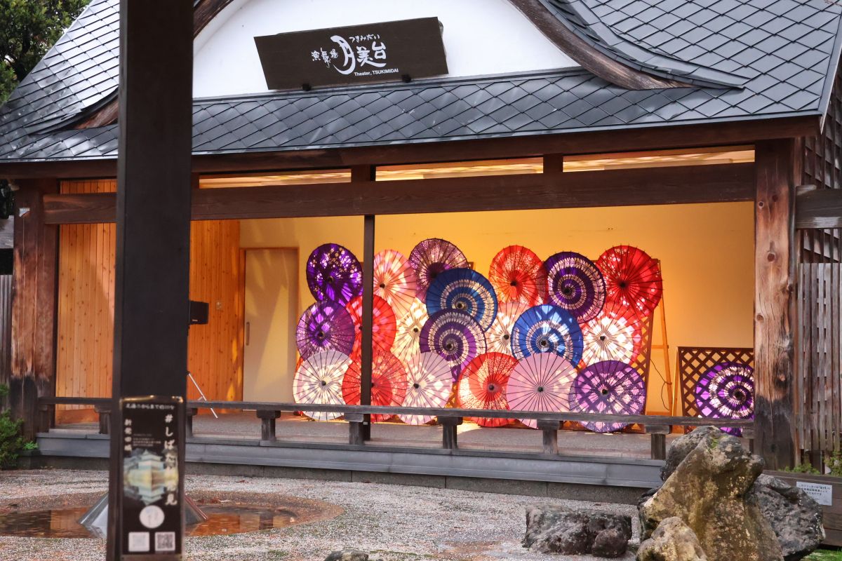 温泉街入口にある「あしゆ湯足美」は、100%源泉掛け流しの足湯です。誰でも無料で利用でき、夜になると色鮮やかな和傘がライトアップされるのも見ものです。