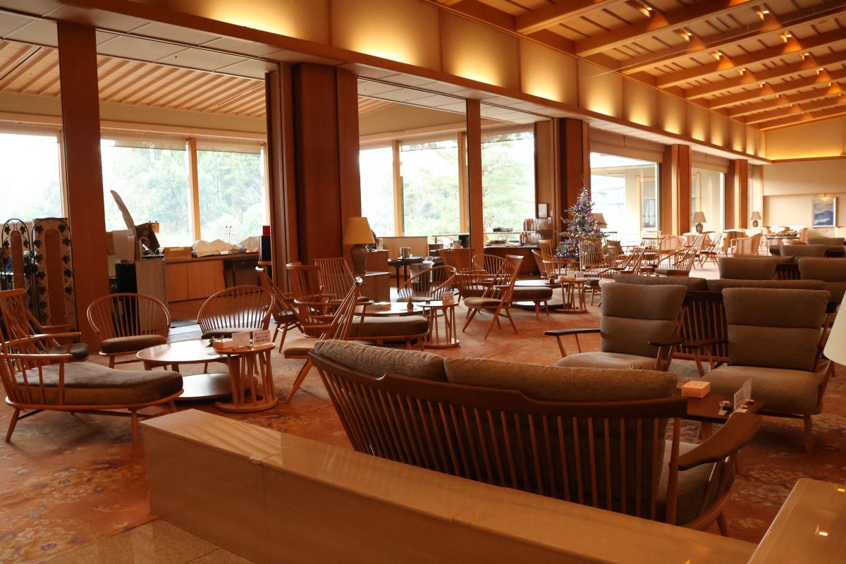 泉慶から越の里まで、大きな窓ガラスから外の景色を眺められる贅沢なつくりの渡り廊下を進んだ先、越の里の専用ラウンジに案内していただきました。