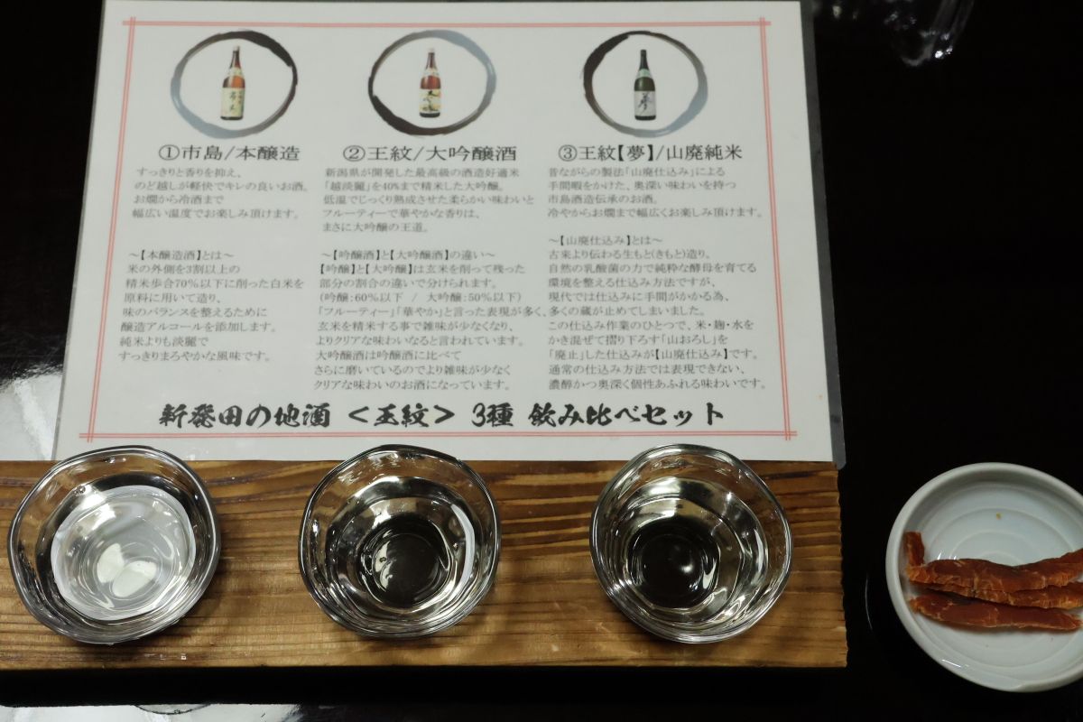 美味しい食事に欠かせないお酒は、新発田市の酒蔵・市島酒造の「王紋」3種飲み比べセットです。お気に入りは山廃仕込みで、奥深い味わいとちょっと乳酸菌っぽい酸味が感じられるのが好きです。