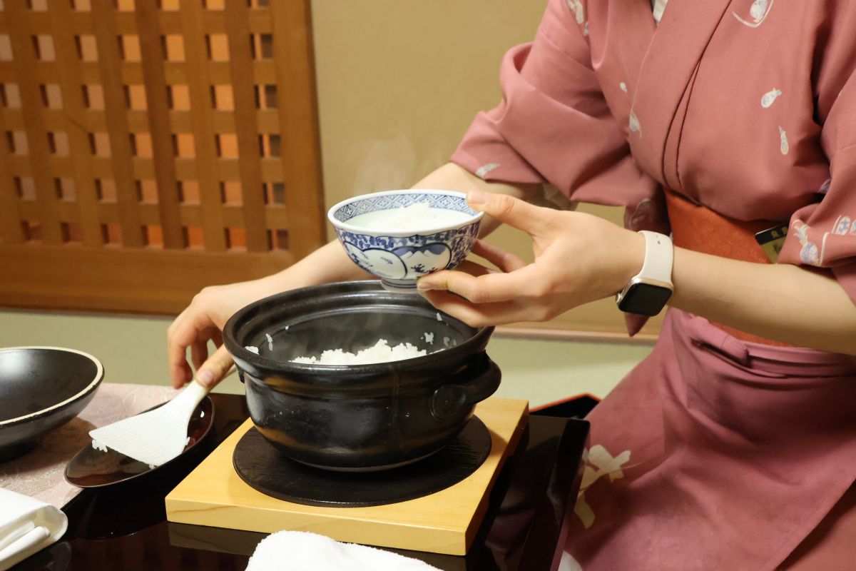 〆はやっぱりコシヒカリで。炊き立ての土鍋からよそってくれるのは新発田産のコシヒカリです。
