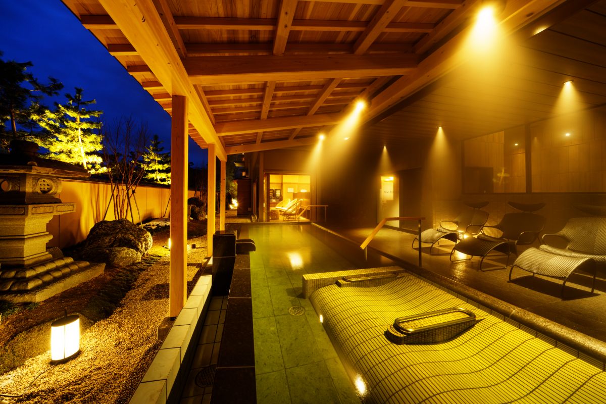 越の里の宿泊客は、客室のお風呂と越の里専用の自家源泉露天風呂、華鳳の回遊大浴場の3種類のお風呂に入ることができます。
