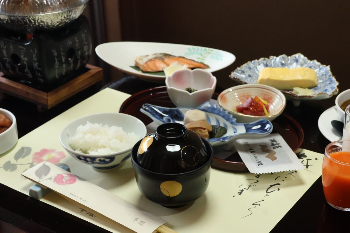 朝食の会場は昨夜と同じ2階の個室でした。鍋の湯豆腐のほかに新発田牛のカレーもついてきます。
