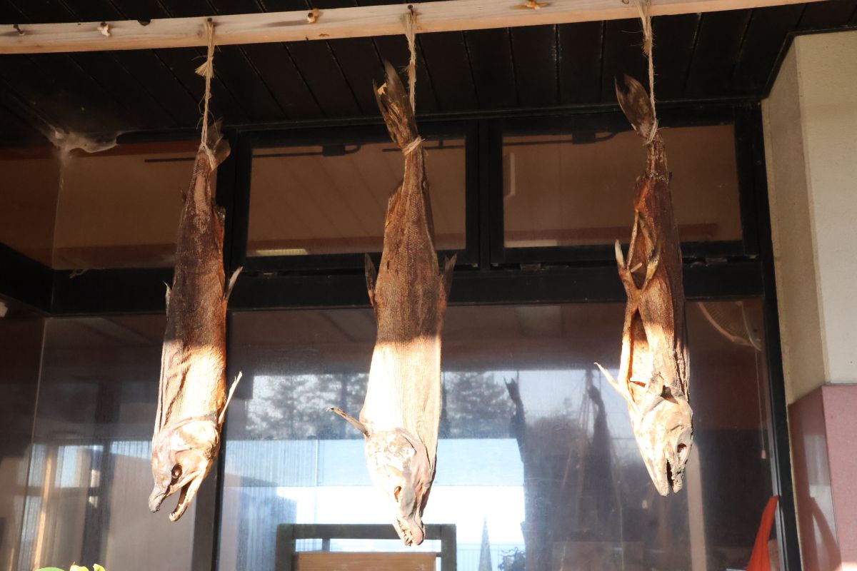 入口の右手には吊るされた立派な鮭が、風に吹かれて揺らめいていました。村上の風物詩です。