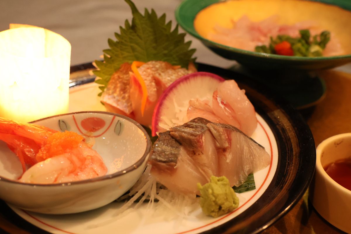 お造りは村上の近海で獲れたお魚3種と、甘海老、白身魚の薄造りです。ボンボリは、日本海に浮かぶ漁火のともしびを表しているそうです。