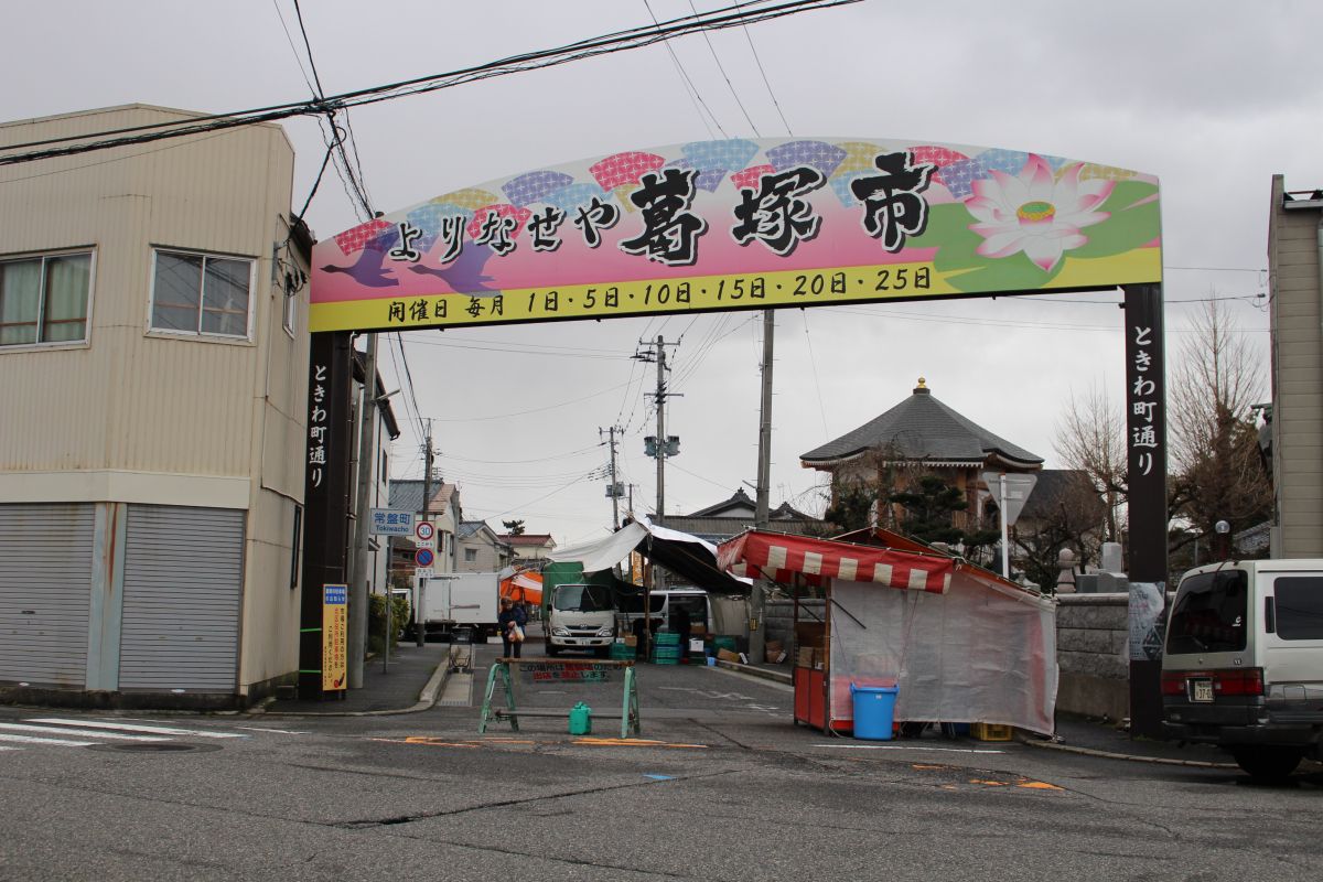酒蔵のすぐ近くでは、約260年の歴史をもつ六斎市(定期市)の葛塚市が開催される。