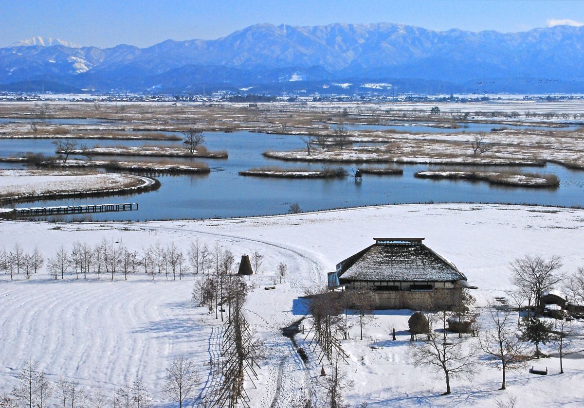五頭連峰に抱かれる福島潟。冬景色も絵になる。