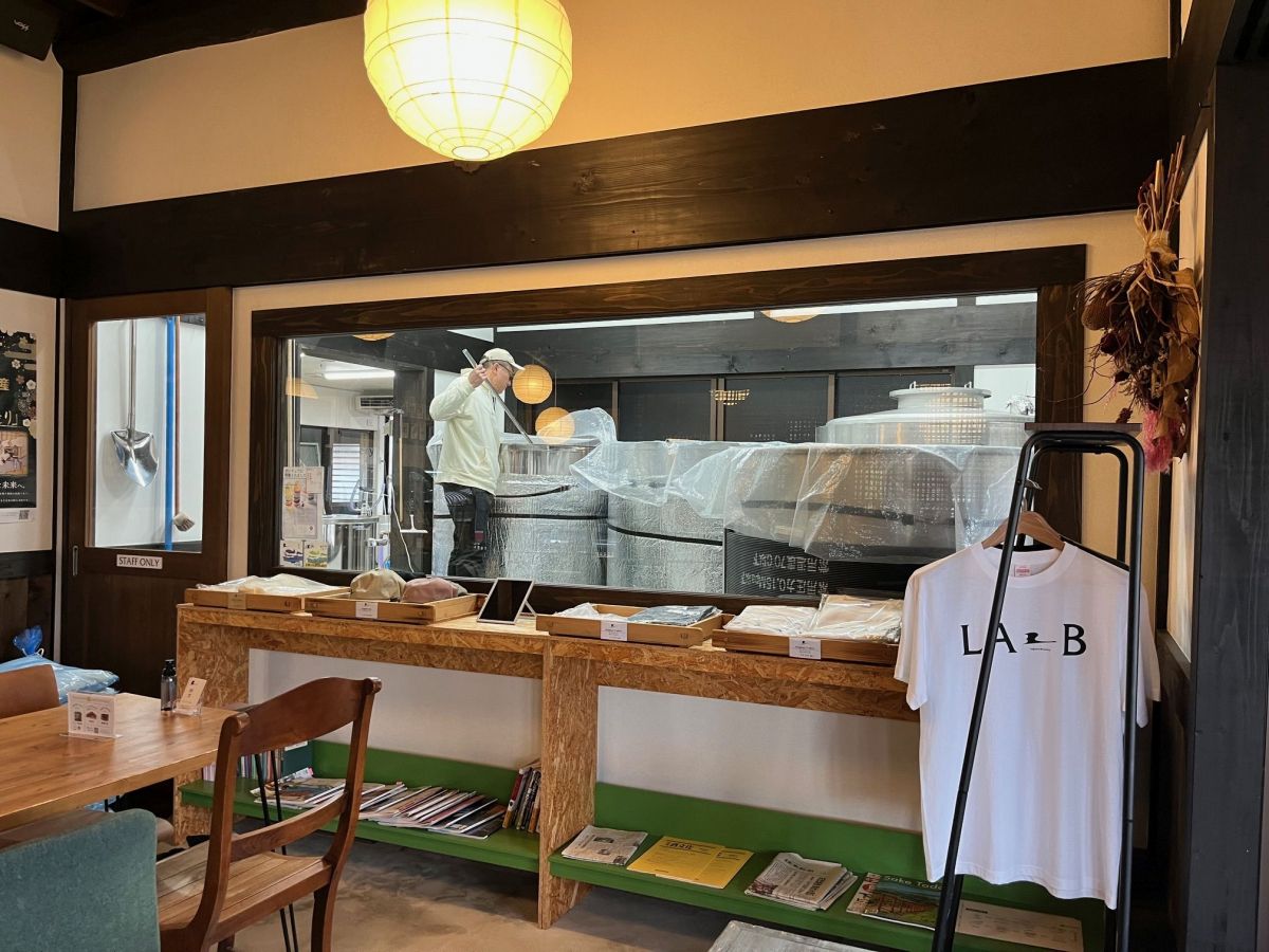 飲食店だった日本家屋をリノベーションした醸造所にはカフェと直売所が併設され、カフェでくつろぎながら、大きなガラス越しに酒造りを見学することができる。