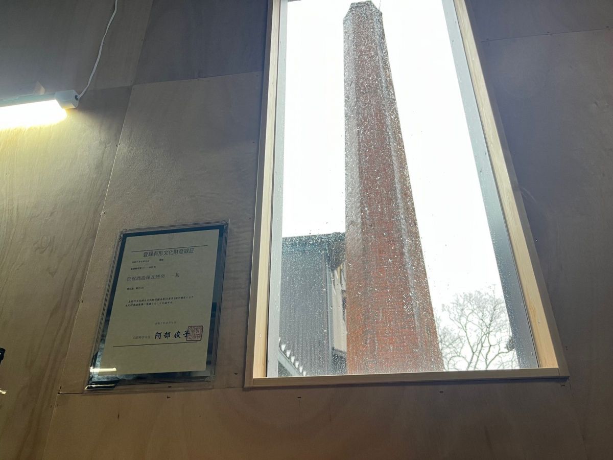 酒蔵見学では、2025年8月に国有形文化財に登録された煉瓦煙突をガラス越しに見ることができる。