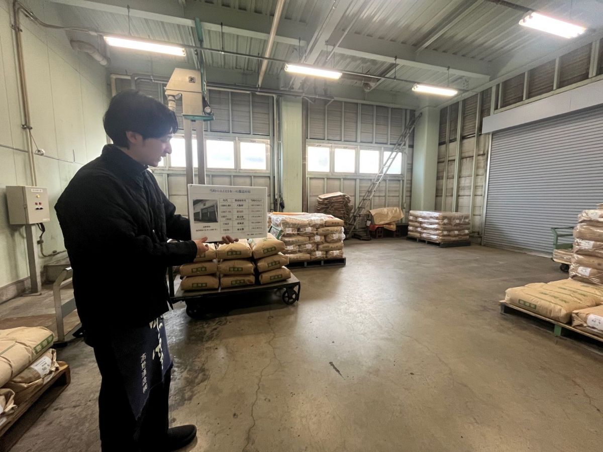 蔵人が原料米倉庫から製造現場、創業時に建てられた旧仕込み蔵まで丁寧に案内してくれる。