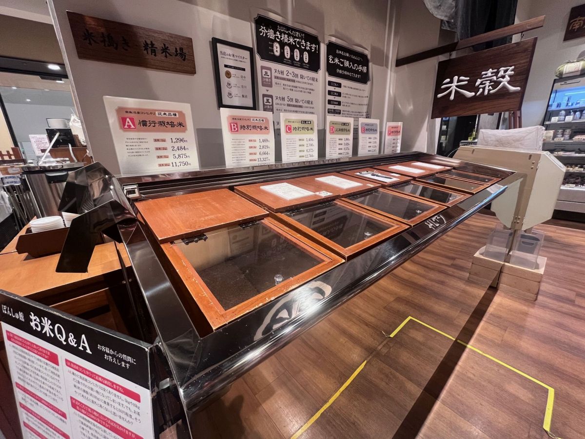 玄米は、冷蔵装置付きのケースで販売するこだわりよう。