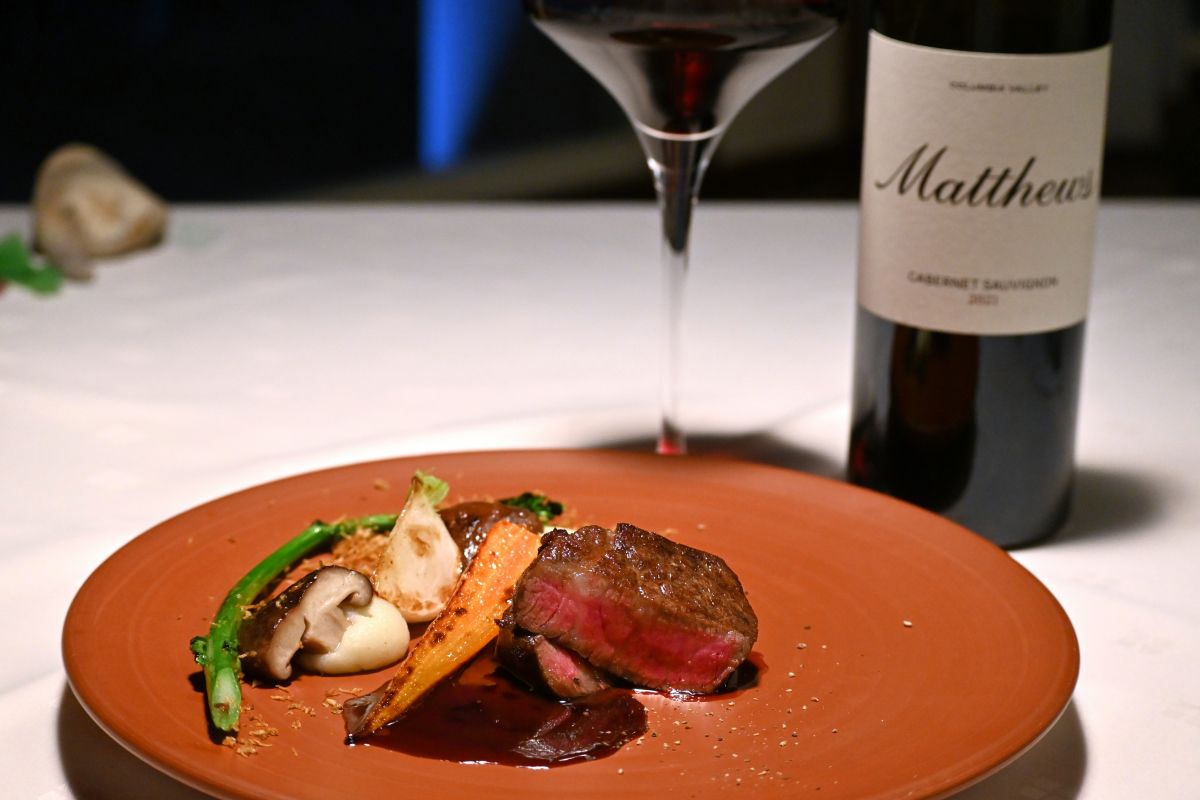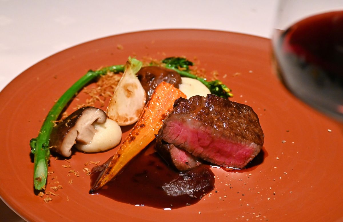 そして、メインは佐渡牛フィレ肉のロースト ソース・ヴァン・ルージュ。佐渡島の伝統工芸である無名異焼の器とともに。