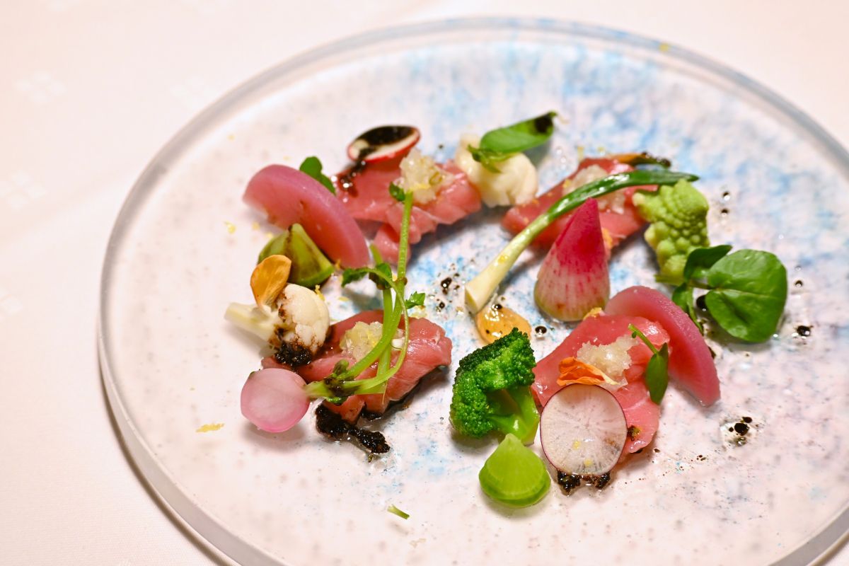 続く前菜は、佐渡産本鮪と彩り豊かな地野菜。